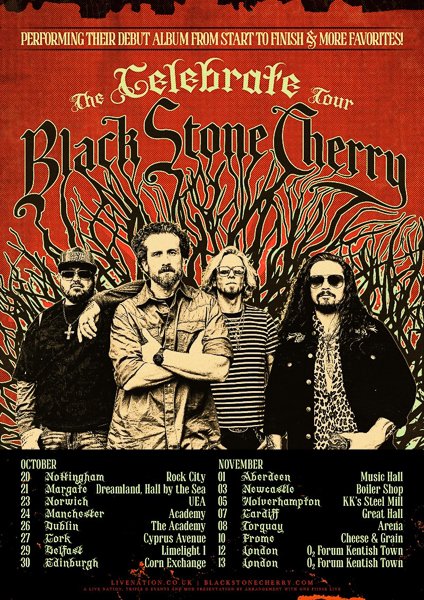 Hailing from Kentucky, USA, BLACK STONE CHERRY have shared plans for a massive headline tour of the UK lasting nearly a month. The special “An Evening With” shows will follow their recently-announced EU tour, and will call through Nottingham, Margate, Norwich, Manchester, Dublin, Cork, Belfast, Edinburgh, Aberdeen, Newcastle, Wolverhampton, Cardiff, Torquey, and Frome, before culminating in two shows in London. The evening will include two separate sets from the southern rockers, playing their legendary 2006 self-titled debut LP in full (marking its 20th anniversary), and a second set of long-time classics and new songs off the upcoming EP, “Celebrate”.