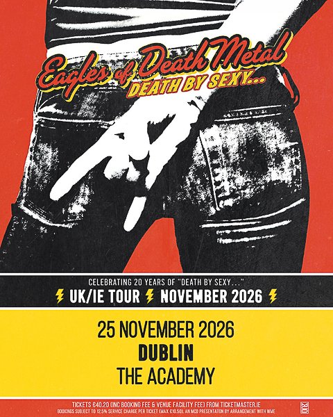 Classic rock band Eagles of Death Metal will hit the road in support of the 20th anniversary of its seminal album “Death By Sexy,” performing the classic release in full as well its greatest hits and a few surprises. Their EU tour will include aheadline date at TheAcademy, Dublin on Wednesday, 25th November 2026.