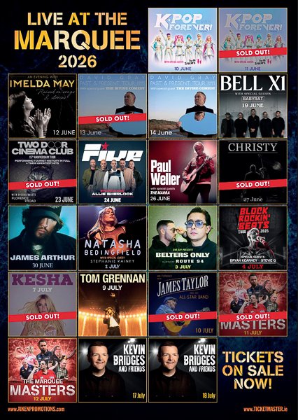 James Taylor and his All-Star Band, The Marquee Masters, Imelda May, David Gray, The Divine Comedy, Bell X1, BABYRAT, Kevin Bridges and friends, Kesha, Tom Grennan, K-Pop Forever! Tribute, Two Door Cinema Club, Florence Road, Five, Allie Sherlock, Paul Weller, THE MARRA, Christy Moore, James Arthur, Natasha Bedingfield, Stephanie Rainey, One Day presents Belters Only, Route 94, The KK Sisters, Dec Pierce Block Rockin’ Beats, Bryan Kearney and Stevie G.
