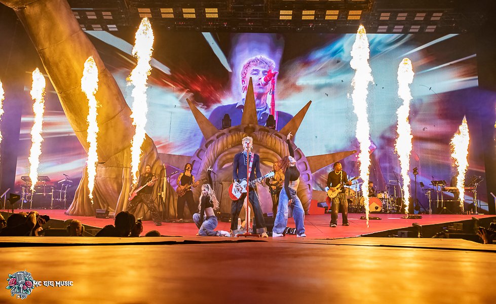 When MGK finally took the stage, the scale of the production became clear. Dominating the arena was a massive stage set built around the head and arm of the Statue of Liberty, a striking visual centrepiece that framed the entire performance. At one of the night’s most memorable moments, MGK climbed onto the giant hand of the statue as a huge Zippo lighter slowly rose from the stage, lighting the cigarette the statue held. It was a cinematic moment that drew a huge reaction from the crowd.