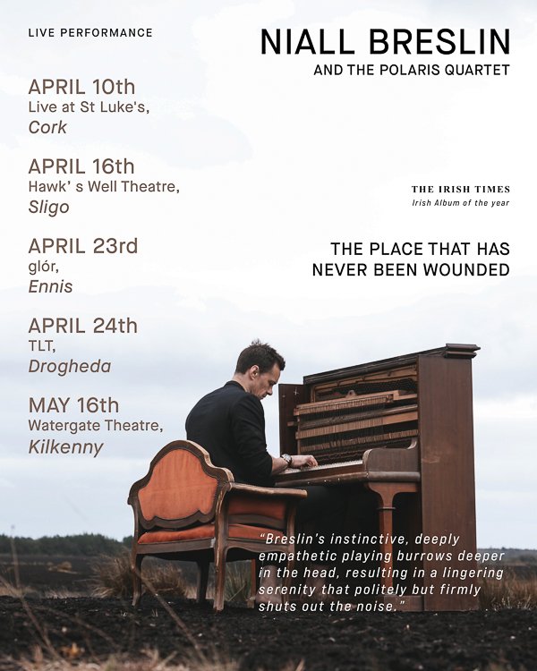 Following a sold-out national run last year, Niall Breslin and The Polaris Quartet return this spring with a renewed series of performances across Ireland. The tour follows the release of Breslin’s latest album, The Place That Has Never Been Wounded, and continues a presentation that has emerged as one of the most distinctive offerings in the contemporary Irish music landscape.