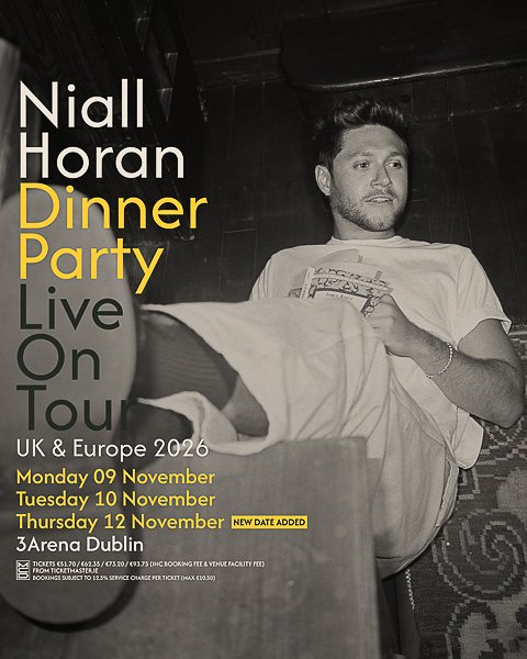 Chart-topping global superstar Niall Horan hasannounced “DINNER PARTY” LIVE ON TOUR. Named for his new album, Dinner Party, the UK and European leg will kick off on September 22, 2026 at Utilita Arena in Birmingham, and include shows at London’s O2 Arena, Dublin’s 3Arena on November 9,10 and 12, Ziggo Dome in Amsterdam, and Paris’ Accor Arena. See below for itinerary.