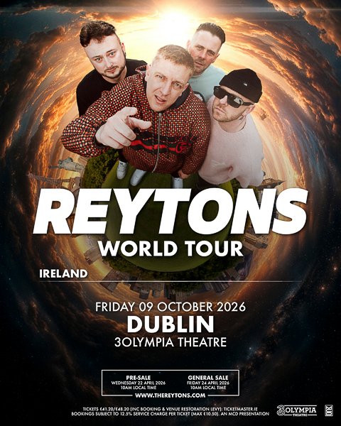 The Reytons, will headline Dublin’s iconic 3Olympia Theatre on Friday, 9th October 2026. From topping the UK charts as a completely independent act to headlining major festivals and performing a capacity concert at the legendary Wembley Arena in 2025, The Reytons have defied every industry expectation. Having hurdled every obstacle with nothing but blue-collar grit and determination, the band—comprising Jonny Yerrell, Joe O’Brien, Lee Holland, and Jamie Todd—is now ready to take their “all-killer, no-filler” sound global. The Dublin date forms a key stop on the band’s highly anticipated first-ever World Tour. The global run kicks off stateside this summer with shows in Dallas, Boston, New York, and LA, before heading to Japan, Australia, and New Zealand. The tour sees the band return to the UK and Ireland for their biggest headline shows to date—including landmark venues like Manchester’s Co-op Live and London’s Alexandra Palace—before concluding in Europe in February 2027. The announcement comes on the heels of their fourth studio album, ‘A Love Letter To A Broken Town’, due for release this July. Rooted in the grit, humour, and honesty of everyday life, the new record sees the band staying true to their South Yorkshire roots while pushing their sound forward with newfound confidence.