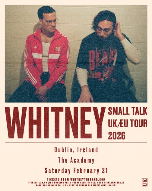 After a decade of being roommates and bandmates, first in Smith Westerns and then in Whitney, Julien Ehrlich and Max Kakacek entered the studio in the Summer of 2024 to begin recording Small Talk sans-producer, with assorted pals dropping in to add parts. The result is 11 incandescent songs that delight on two levels. There are instant classic Whitney songs here, tunes that tug at the same heartfelt melodic strings they’ve always pulled, and still other moments that speak to how much room they gave themselves to evolve.